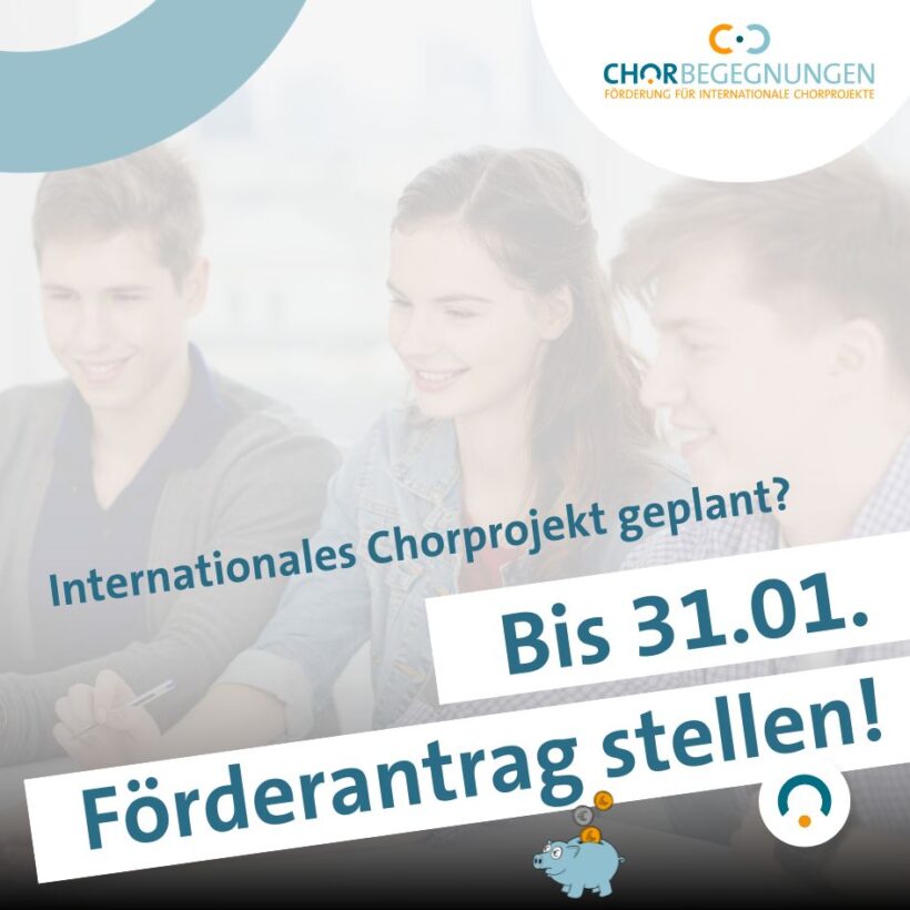 Online-Workshop am 13.01. Ihr plant ein internationales Chorprojekt dieses Jahr? Dann nehmt am Online-Workshop „Fit für die Förderung“ am Samstag, 13.01. von 10:00 bis 14:00 Uhr teil! Der Workshop qualifiziert...