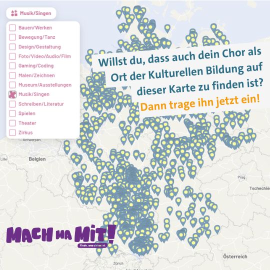 Wo überall in Deutschland können Kinder und Jugendliche im Chor singen? Beteiligung euch an interaktiven Deutschlandkarte von mach ma mit! und tragt euren Kinder- oder Jugendchor als Ort kultureller Bildung dort ein! Mit einigen wenigen Klicks ist der Eintrag gemacht.
