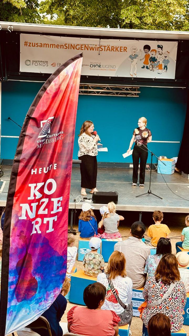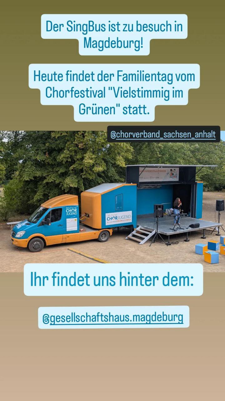 Am Sonntag, 17. August. 2025 war der SingBus Teil des Chorfestes „Vielstimmig im Grünen“ im Klosterbergegarten Magdeburg und besuchte den Chorverband Sachsen-Anhalt. Der Tag stand ganz im Zeichen der Familien: Ab 13:30 Uhr wurde gesungen, die Sing- und Klingausstellung entdeckt, es konnte auf und vor der SingBus- Bühne gesungen und getanzt werden. Es gab noch weiter Stationen für Kinder und Jugendliche wie das Basteln von Mikrophonen und ein Glücksrad mit tollen Preisen.