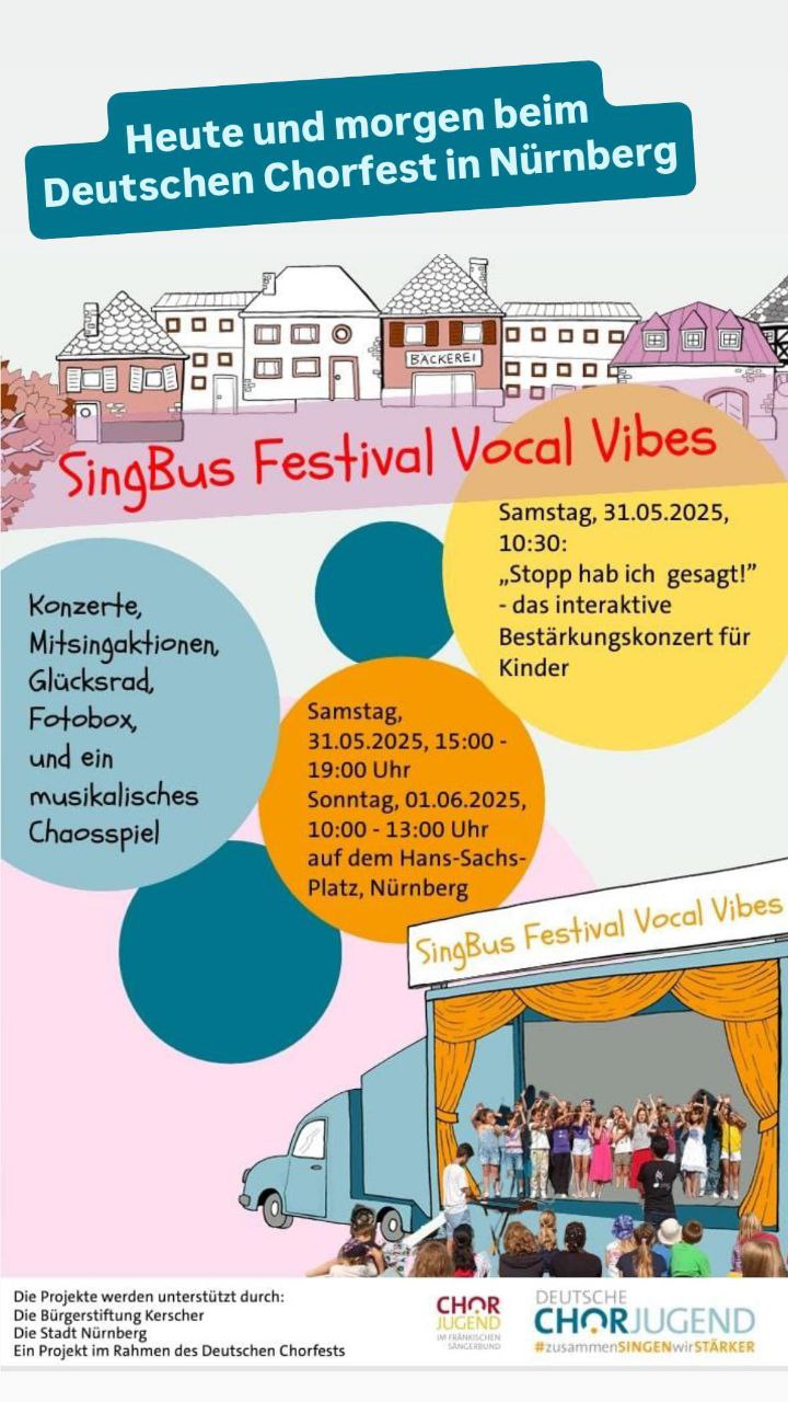 Am 31.05. und am 01.06. 2025 war der SingBus im Rahmen des Chorfestes in Nürnberg. Organisiert von den jungen Menschen der Chorjugend im fränkischen Sängerbund veranstalteten wir gemeinsam das bunte SingBus- Festival „Vocal Vibes“ auf dem Hans-Sachs-Platz in Nürnberg.