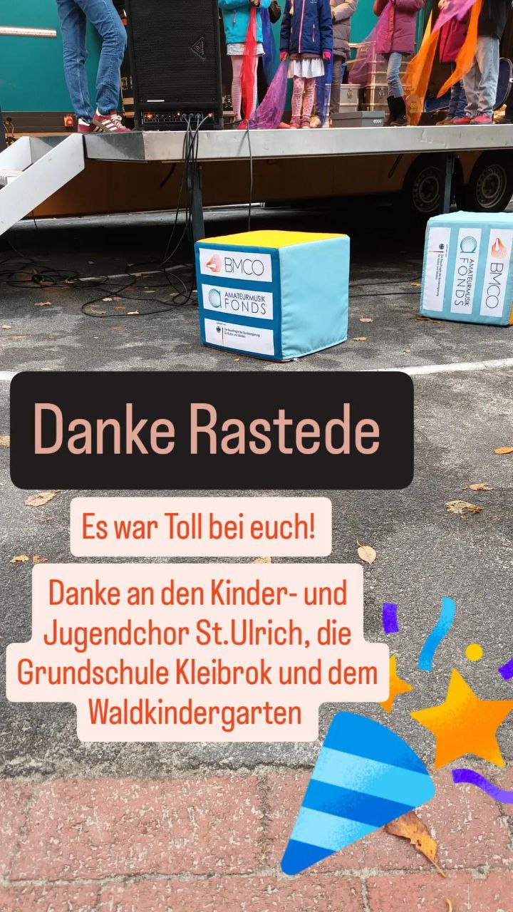 Vormittags machten wir Workshop Programm mit allen Kindern aus der Grundschule Kleibrok und dem Waldkindergarten Rastede. Unsere für Niedersachsen zuständige Musikpädagogin Julia begeisterte die Grundschulkinder. Ab 16:30 Uhr haben wir Jung und Alt zu einem bunten Nachmittagsprogramm mit Konzert, offener Chorprobe des Kinder- und Jugendchores St. Ulrichs und der Sing- und Klangausstellung eingeladen. Die offene Chorprobe richtete sich an Kinder zwischen 5 und 12 Jahren.